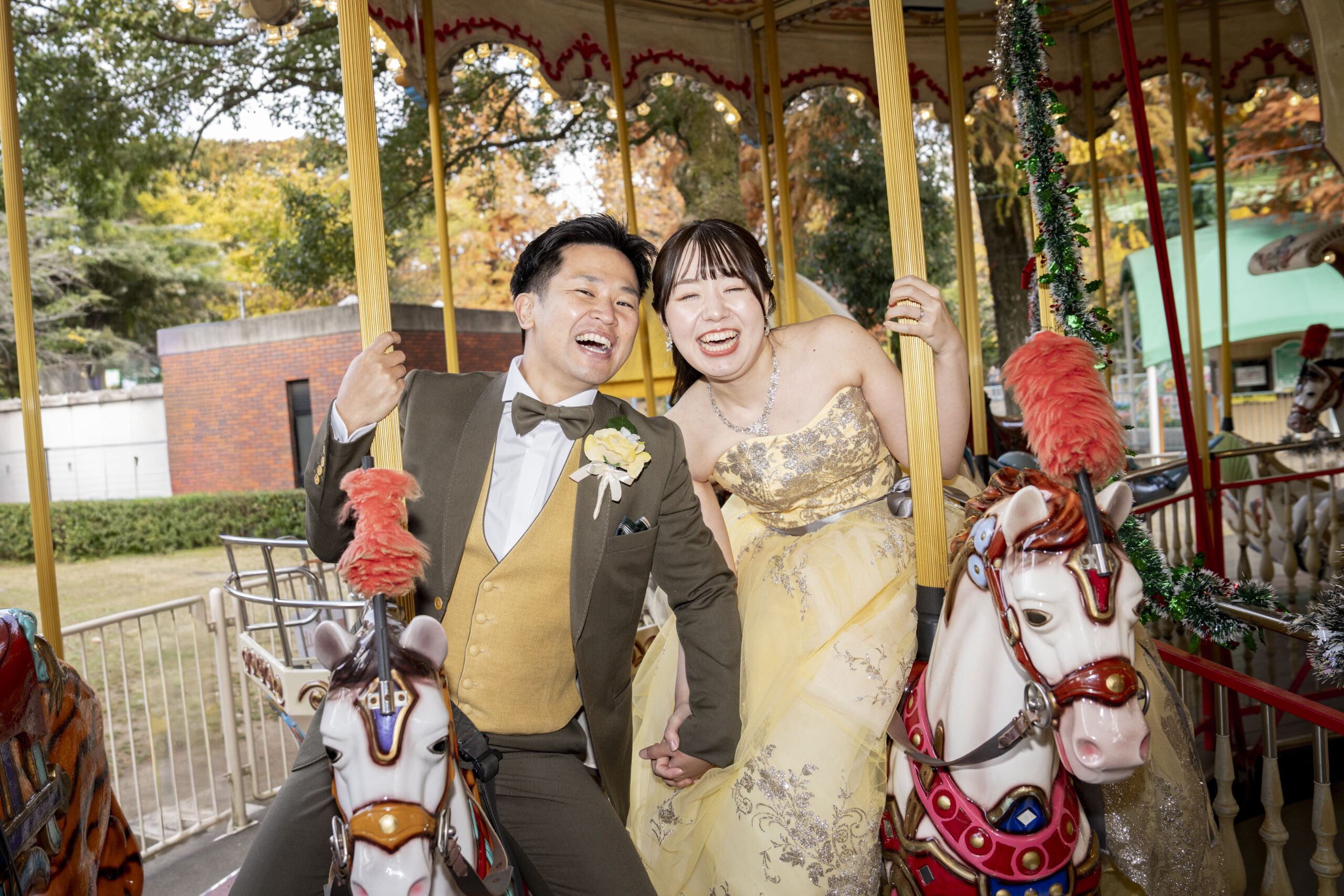熊本市動植物園内にあるメリーゴーランドに乗って撮影しました! 笑顔がとても素敵でお二人らしい写真が撮れました